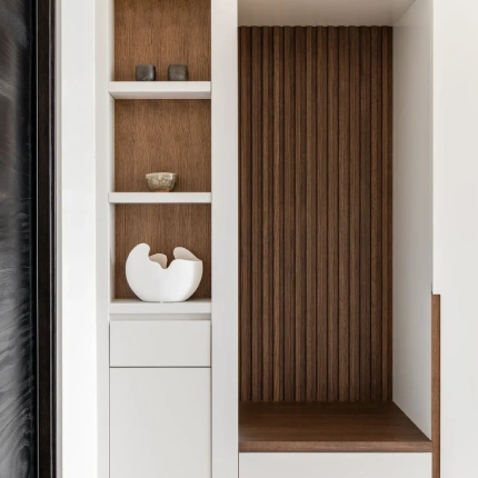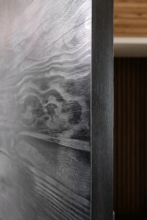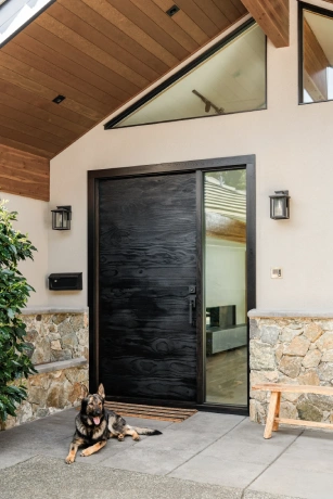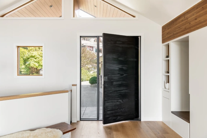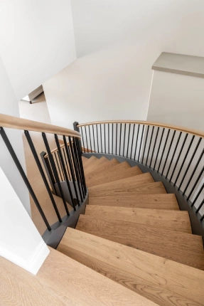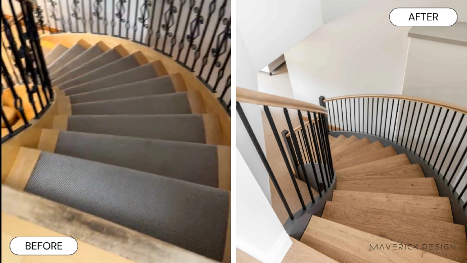 The entry was transformed with a dramatic 4-foot pivot door featuring a Shou Sugi Ban finish—an architectural moment that sets the tone from the first impression. Inside, the original curved floating staircase was refreshed and refinished to reflect the home’s new modern identity, while preserving its sculptural form.