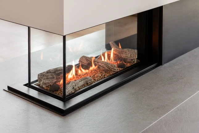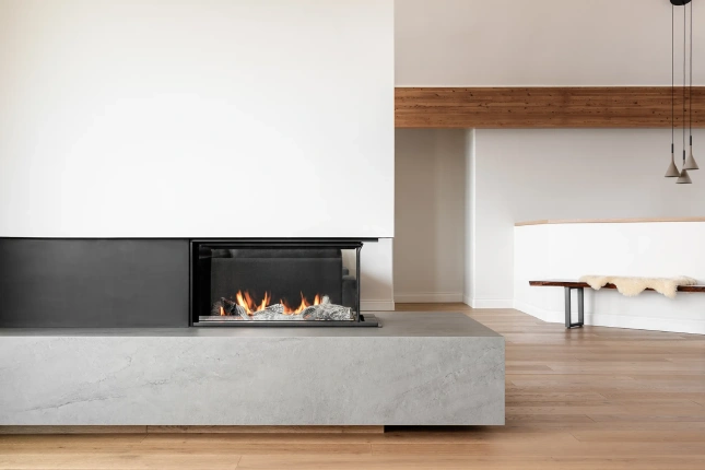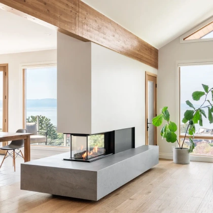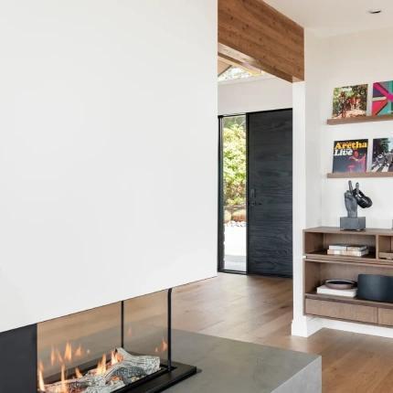 This extensive renovation focused on enhancing flow, light, and material consistency. We unified the interior with wide plank European oak hardwood flooring, creating a calm and cohesive foundation throughout. At the heart of the home, the existing three-sided fireplace was reimagined with a seamless monolithic hearth slab and a floating surround, anchoring the main living area with understated elegance.