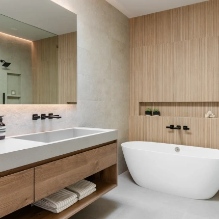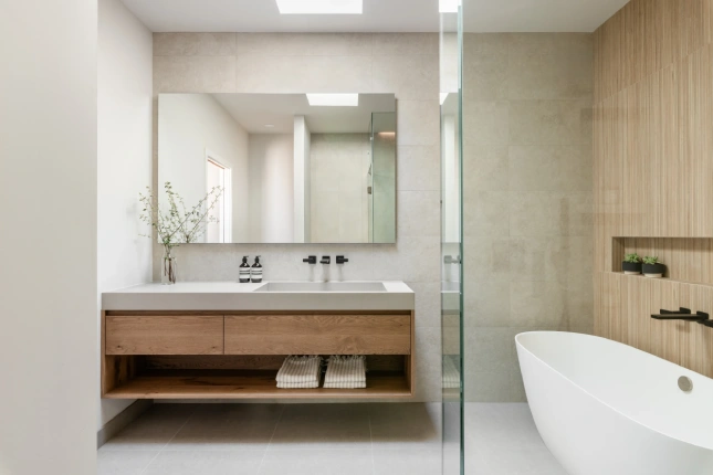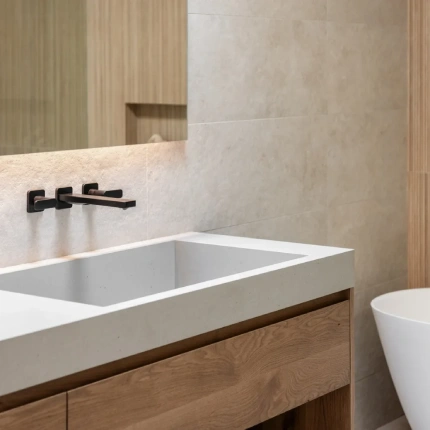 We took great care in maintaining the integrity of the original exposed beams, reintroducing them into the contemporary palette for warmth and architectural continuity. In the primary ensuite, we stripped the space down to its structure to craft a serene retreat, now featuring a curbless walk-in shower with oversized format tile and a custom-integrated stone sink—a reflection of the clients’ unwavering attention to detail and appreciation for material craftsmanship.